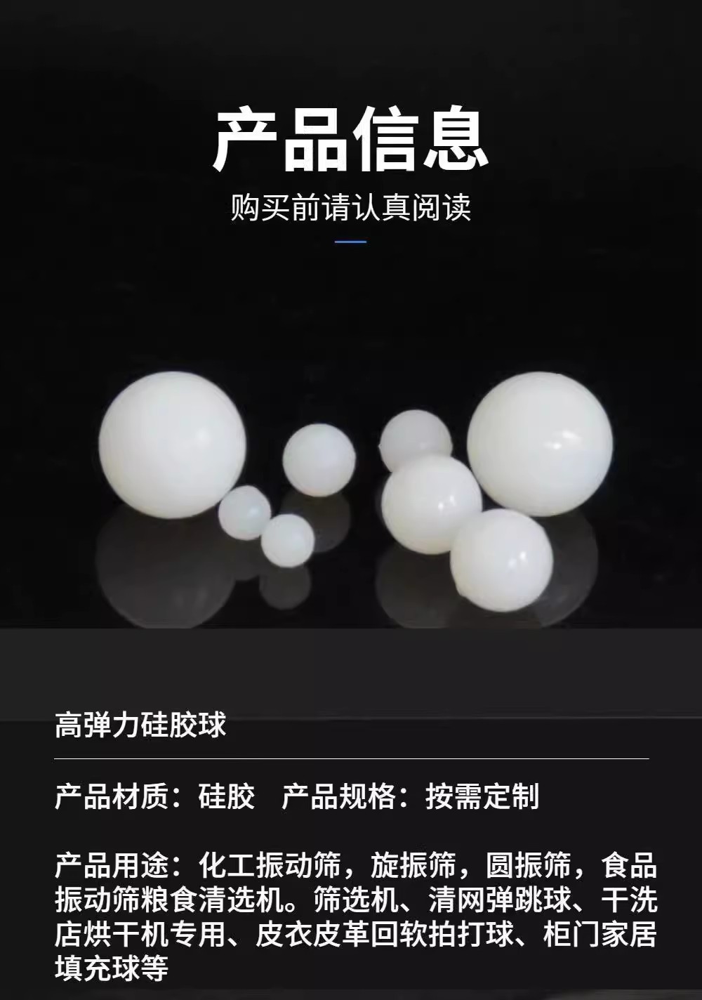 安裝在旋振篩的沖孔板與篩網(wǎng)之間,當旋振篩工作時,硅膠球利用自身的彈力和重量,隨著篩體的振動而產(chǎn)生跳動,不斷地撞擊篩網(wǎng),使粘在或卡在篩孔之間的物料被拋起并落下,從而實現(xiàn)清網(wǎng)功能,提高物料的透網(wǎng)率和篩分效率。 應用領域 廣泛應用于食品、醫(yī)藥、化工、礦產(chǎn)、機械、金屬冶金等行業(yè)。例如在食品行業(yè)篩分面粉、糖粉等物料時,硅膠球的環(huán)保特性可確保產(chǎn)品不受污染;在醫(yī)藥行業(yè)篩分藥品顆粒時,能保證藥品質(zhì)量安全。 外觀特點 硅膠球通常為乳白色的透明或半透明球體,外表光滑圓潤,手感適宜,彈性好,韌性足,這種外觀特性有助于其在篩網(wǎng)間順暢跳動,同時也便于觀察其磨損情況,及時進行更換。